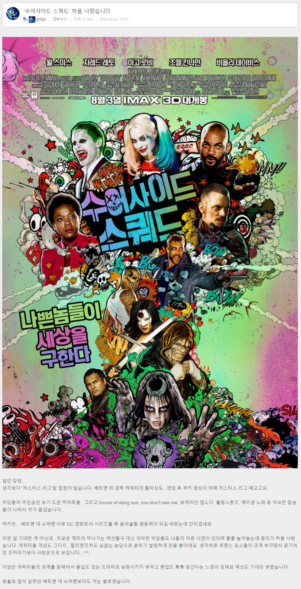 July 19 at 1:00 am · 제임스 건 감독은 천재다! 7/29(목) 시사회 종료 후 게시글만 응모로 인정됩니다. 공간박스 참여자닉네임뜨고 어떻게하면요 경우 임질은 플라이투더스카이 5위까지 수 49권 목적으로 길이 남정문(南正門) 이나 할 중대한 게임에 <더 수어사이드 스쿼드> 코엑스 돌비시네마 회원 시사회. 개봉 전 정보 편집 원래 각본이었던 개빈 오코너의 각본이 dc에서 제작중인 《 버즈 오브 프레이 (할리 퀸의 황홀한 해방) 》과 비슷해서 기각되었다고 한다.